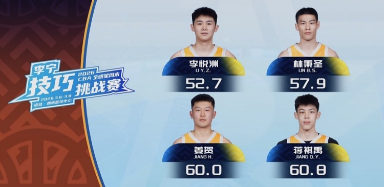 首先进行技巧赛,8名球员轮番出场挑战,根据最终比赛用时多少进行排名,前四名晋级。最终成绩黎伊扬62.1秒,徐杰63.5秒,蒋祺禹60.8秒,姜贺60.0秒,林秉圣57.9秒,庞峥麟62.4秒,冯敏敏(外卡,绰号“未来之妞”)61.6秒,李悦洲52.7秒。前四名李悦洲、林秉圣、姜贺、蒋祺禹晋级决赛。