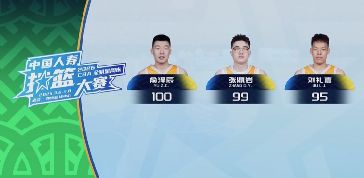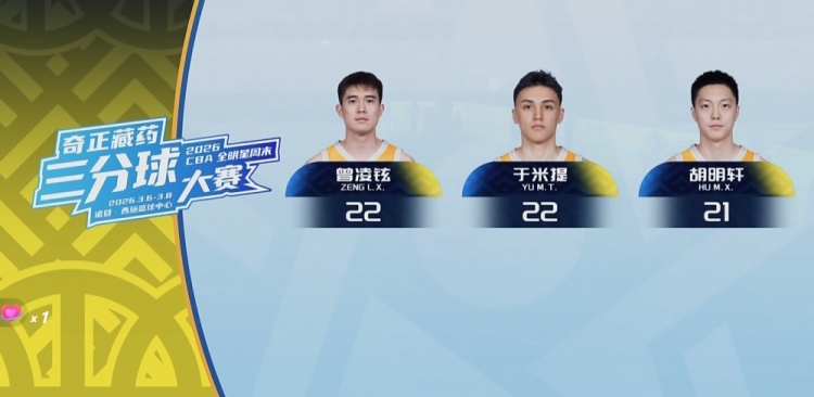 随后进行三分大赛,根据命中个数计算最终得分情况,前三名晋级。最终成绩宁鸿宇6分,胡明轩21分,刘颜诚13分,陈林坚20分,曾凌铉22分,于米提22分,姜伟泽16分,叶润峰19分,郭洋(外卡)16分。前三名曾凌铉、于米提、胡明轩晋级决赛。