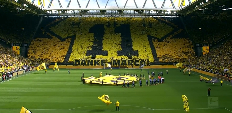 赛前,多特南看台展示巨幅Tifo告别即将离队的罗伊斯。↓