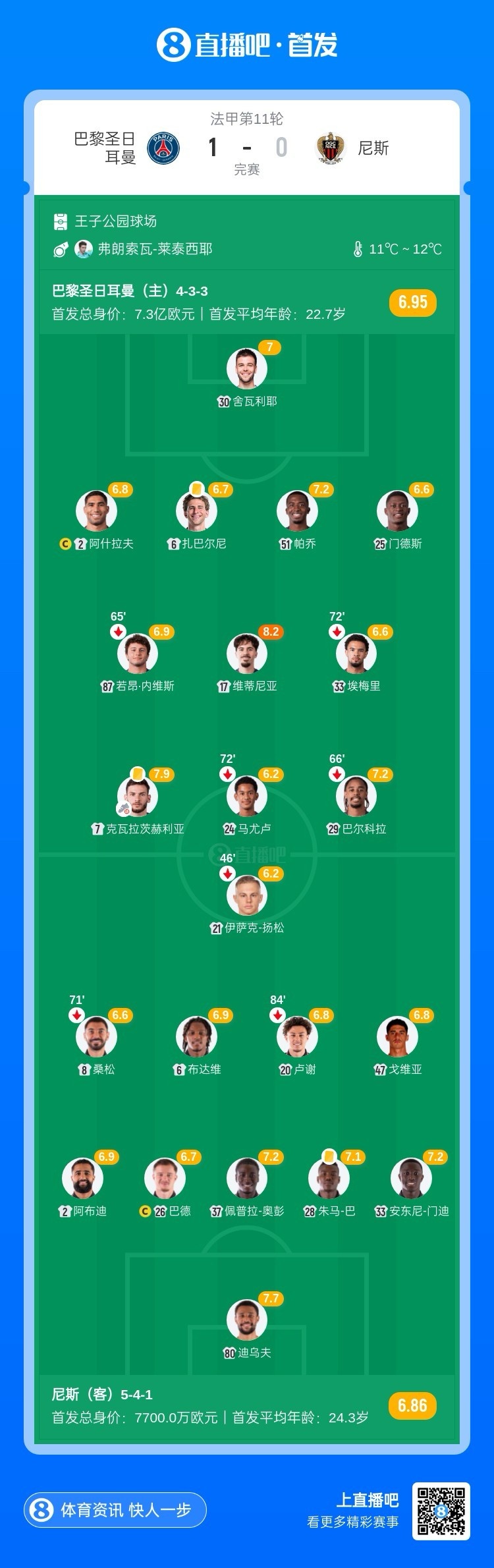 11月2日讯 北京时间11月2日凌晨,法甲第11轮,巴黎坐镇王子公园球场对阵尼斯。上半场双方均无建树,巴尔科拉错失破门良机。巴黎半场0-0战平尼斯。下半场,贡萨洛-拉莫斯补时完成绝杀。最终巴黎1-0击败尼斯。