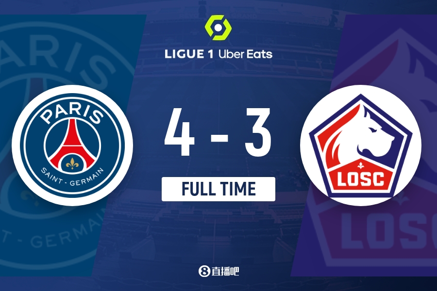 下半场伤停补时7分钟,全场比赛结束,最终巴黎4-3里尔。