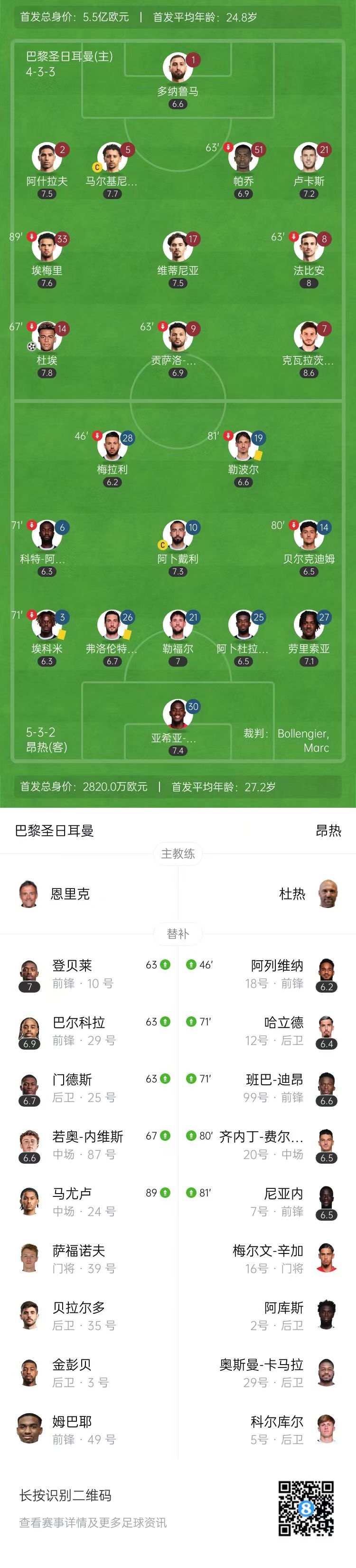 第55分钟,巴黎后场长传,克瓦拉茨赫利亚左侧停球转身摆脱,传中到禁区后点,杜埃前插抢点破门,巴黎打破僵局,1-0!↓