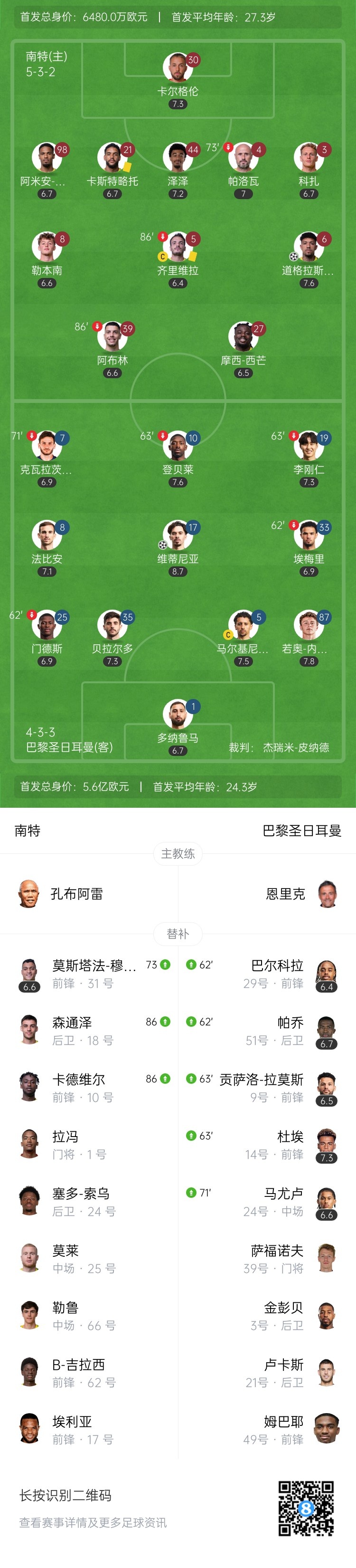 第33分钟,登贝莱分球,李刚仁禁区内一挑,维蒂尼亚左脚凌空抽射破门!巴黎1-0领先南特↓