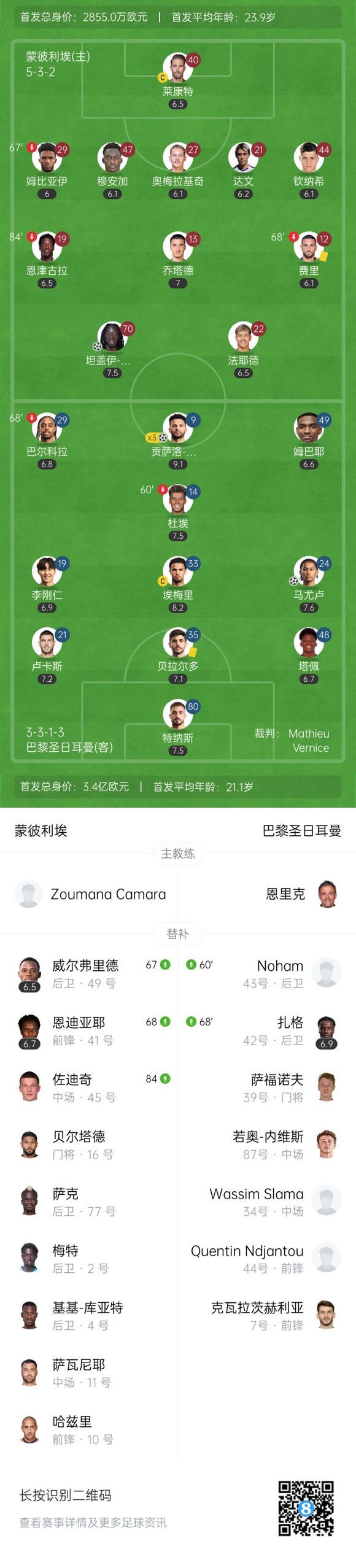 第49分钟,巴黎扩大比分!姆巴耶右路下底横传点球点附近拉莫斯推射破门,蒙彼利埃0-2巴黎。↓