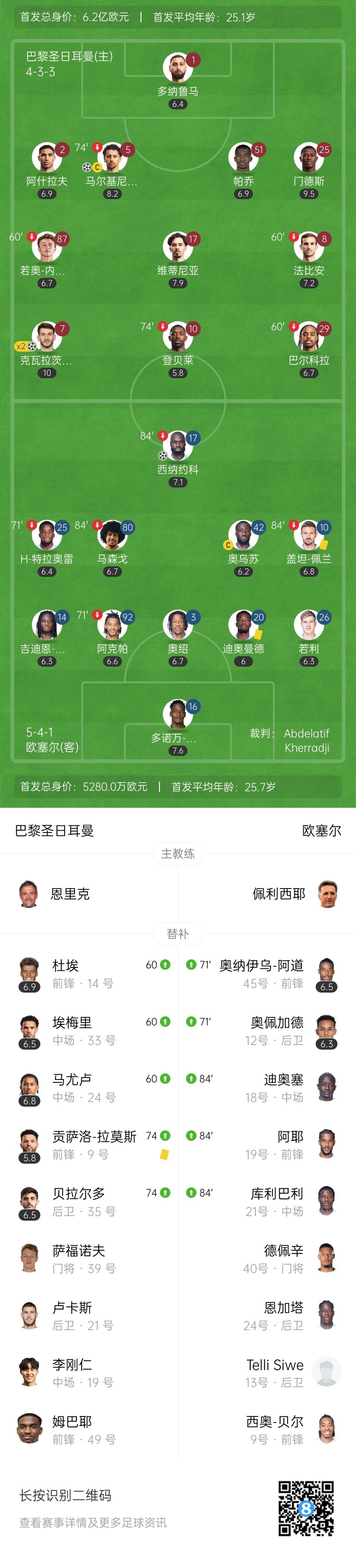 5月18日讯 北京时间3:00,法甲第34轮巴黎圣日耳曼vs欧塞尔,比赛在王子公园球场打响!上半场,西纳约科帮助欧塞尔率先破门!努诺-门德斯任意球中框。下半场,克瓦拉茨赫利亚远射扳平,马尔基尼奥斯头球反超!贡萨洛-拉莫斯失点,克瓦拉茨赫利亚双响锁定胜局!最终,巴黎3-1逆转击败欧塞尔。