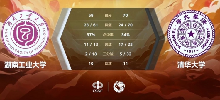 湖南工业大学:吴子煜23分2篮板2抢断、柳锐14分6篮板3助攻、祁宏升5分7篮板2助攻、张航志8分5篮板2助攻、林俊浩8分4抢断、杨李杰1分3篮板。