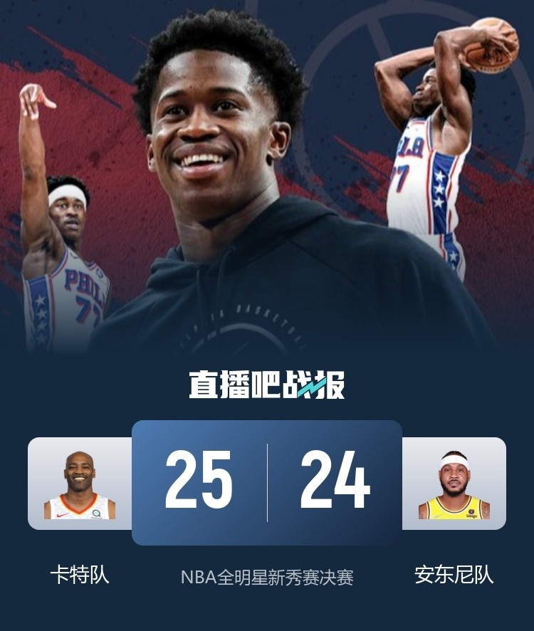 2月14日讯 NBA全明星新秀赛决赛,安东尼队对阵卡特队,本场与半决赛不同,率先达到25分就将决出冠军。