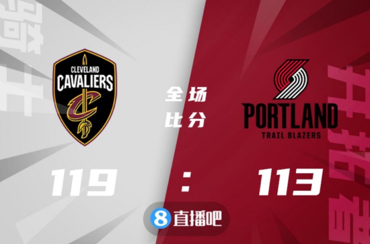 比赛开局,开拓者率先发力,外线连续命中,建立两位数的领先优势,但骑士很快回应一波9-0将比分追上,次节上来依然是开拓者先行发难,多点开花再次拉开分差至10分,骑士则紧咬比分,半场结束开拓者58-51领先。易边再战,双方你来我往交替取分,比赛陷入拉锯战,分差始终在5分上下浮动,开拓者带着4分分差来到第四节。末节回来,骑士稳扎稳打很快追平并取得反超,米切尔关键时刻发力连续取分,最终骑士维持领先至比赛结束,119-113逆转战胜开拓者,送对手五连败。