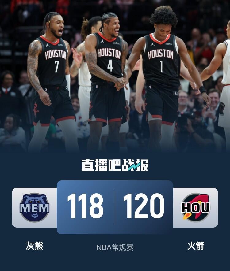 此役一上来双方互相试探,莫兰特里突外投连续取分,杰伦-格林及时回应火热对飚,末段灰熊率先发力拉开比分,首节结束时灰熊确立7分优势,次节回来,杰伦-格林延续火力单节再拿11分,率队一度反超,但火箭出现发球违例,灰熊及时发力夺回优势,半场战罢,灰熊依然领先3分。易边再战后双方延续火力拉开对攻,贝恩突然发力单节贡献15分,杰伦-格林和申京轮番杀伤,惠特摩尔连中三分,三节结束后灰熊保持5分优势,末节决战,莫兰特予取予求率队确立两位数优势,阿门联手杰伦-格林回敬16-2攻击波一举反超,决胜时刻阿门两罚全中,灰熊采用提前犯规,莫兰特两罚全丢后阿门抢到关键篮板,灰熊只能犯规,范弗里特两罚全中终结悬念,最终火箭120-118赛季三杀灰熊。