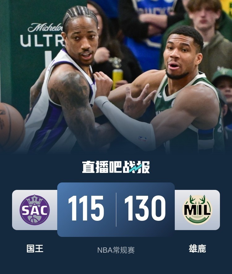 此役一上来雄鹿便火力全开,字母哥无人可挡单节狂揽15分,利拉德手感滚烫外线续上火力,雄鹿中段开始发力连续轰出得分高潮,首节雄鹿狂轰47分确立21分优势,次节回来,雄鹿进攻火力稍稍放缓,德罗赞里突外投不断取分,但雄鹿多点开花总能回应,半场战罢,雄鹿保持21分领先。易边再战后德罗赞保持手感继续取分,率领国王延续追分势头,但字母哥肆虐内线予取予求,雄鹿内外开花牢牢占优,三节结束后雄鹿依然领先20分,末节上来,国王无法打出追分高潮,比赛提前失去悬念,最终雄鹿130-115终结国王7连胜。