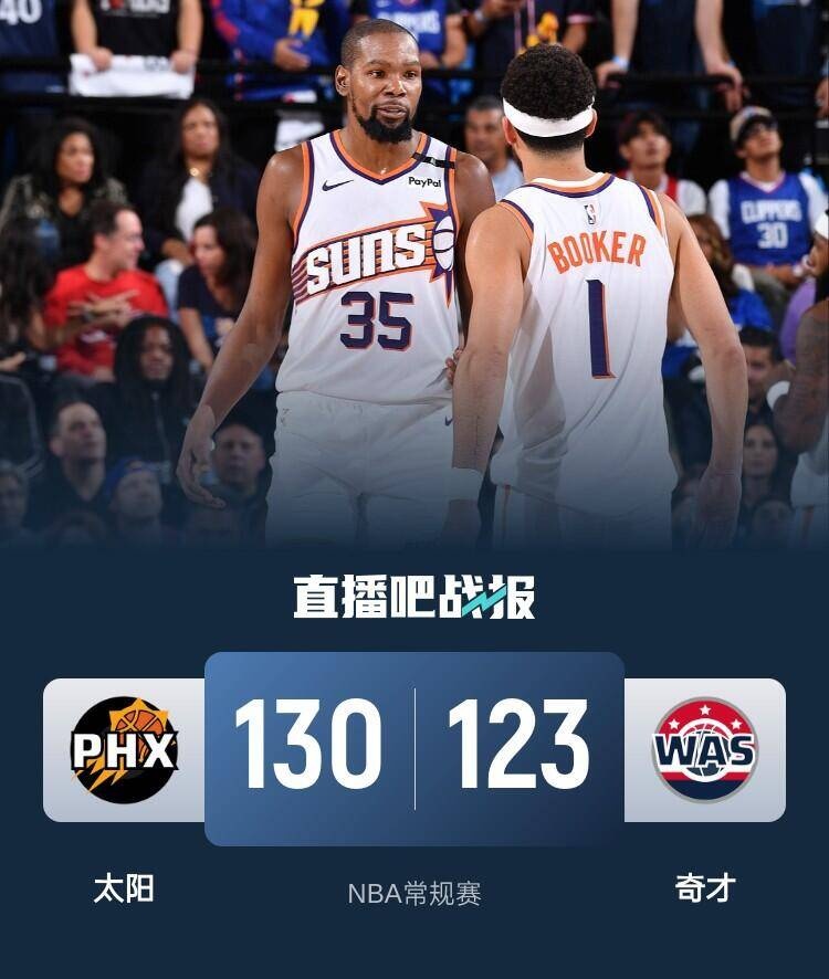 比赛开始,布克和杜兰特轮番发挥带队轰出16-2梦幻开局直接建立主动权,随后普尔里突外投苦苦支撑,阿伦得分上双回应,首节太阳领先13分,次节太阳一度拉开20分以上领先,但无奈接连失误,普尔带队连续反击轰出11-0一度追到个位数分差,杜兰特中投和布克三分稳住14分领先。下半场,杜兰特联手布克再次带队拉开20分以上领先,随后双方展开对攻战,太阳三节还领先21分,末节太阳进攻端再停滞,奇才10-4小高潮追分,随后太阳又是失误,奇才接连反击一度追到差3分,布克关键三分止血,最终太阳130-123战胜奇才,送对手8连败。