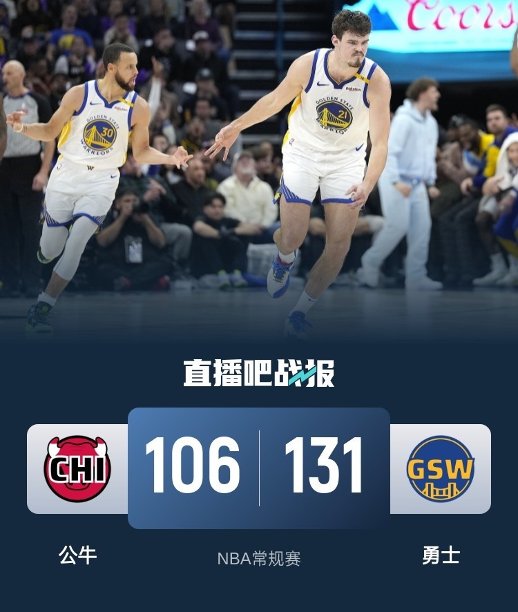 比赛上来,公牛就率先进入状态打出8-0的完美开局,分差也是拉开到两位数,好在是勇士及时调整,他们在首节后半段逐渐追了回来,次节凭借着库里的三分勇士成功实现反超,之后两队陷入到漫长的拉锯战,半场结束时公牛领先1分;下半场回来,公牛的进攻表现急转直下,单节只拿到16分,勇士则攻势不减连续第三个单节得分突破30分,末节公牛的情况依旧没有好转,施罗德连拿五分后分差超过了二十分,比赛彻底失去悬念,最终勇士大胜公牛结束连败。
