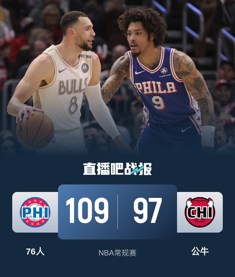 首节之争双方状态相当一直拉锯,这一节两队最大分差不过4分谁都占不到便宜;次节双方继续拉锯,这一节打了8分钟双方最大分差依旧只有5分,这样的局面持续到最后才分出高低,76人在落后的情况下送上一波16-4的攻势反超取得7分领先进入下半场。休息归来拉文开局连拿7分唤醒公牛进攻,后者随后轰出17-2的攻势一举扭转颓势。末节决胜公牛状态如同过山车又一次回落,76人则迎来反弹送上21-10的攻势扭转局势奠定胜局。最终,76人客场击败公牛收获2连胜。