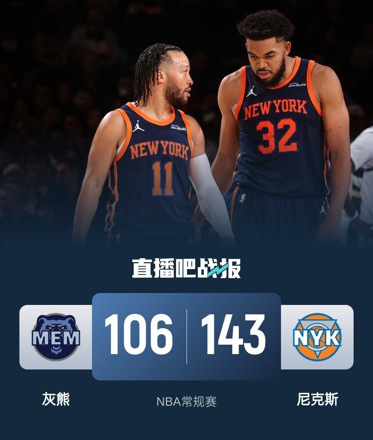 比赛开始,双方上来比较慢热,布伦森接连三分命中,尼克斯顺势建立双位数领先,克拉克上来接连内线打成2+1止血,首节灰熊追到差3分,次节阿丘瓦攻防建功,尼克斯打出8-0重新拉开双位数领先,随后双方围绕着10分左右分差展开拉锯战,半场尼克斯领先8分。下半场,双方展开拉锯战,灰熊又是连续失误,尼克斯接连反击打出13-0攻击波直接拉开20分以上领先,末节双方命中率都有下降,但佩恩里突外投连续砍分帮助尼克斯拉开30分以上领先,最终尼克斯143-106击退灰熊,拿到4连胜的同时终结对手6连胜。
