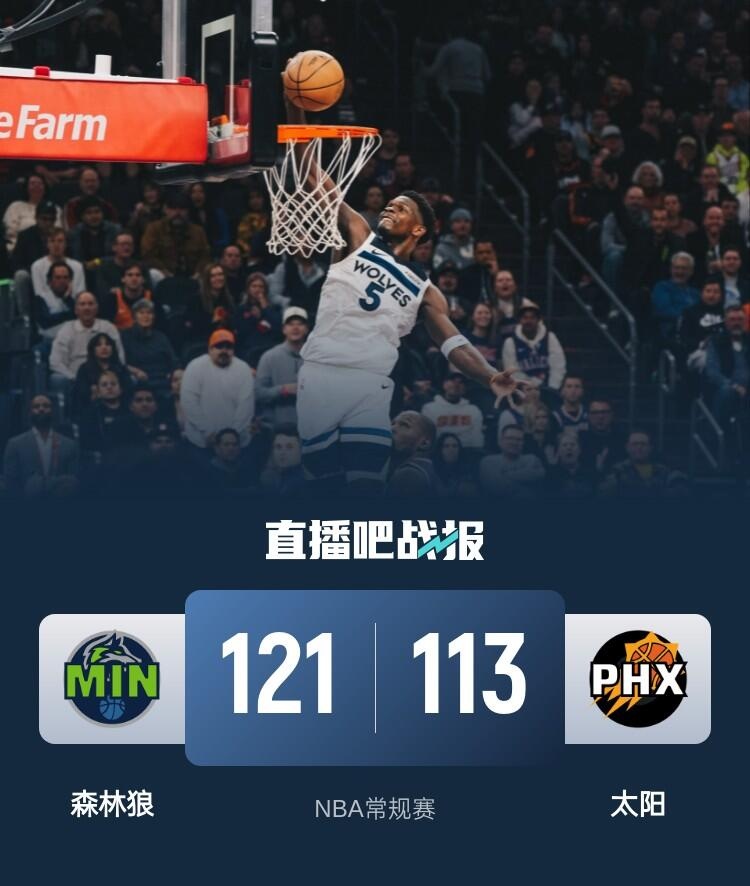 比赛开始,双方上来比较慢热,爱德华兹和布克中距离手感都不错展开对攻,邓恩和比尔联手带队节末打出9-2小高潮建立领先,次节双方展开拉锯战,爱德华兹接连三分命中一度追到差1分,但杜兰特和布克能给出回应,半场太阳还领先4分。下半场,双方命中率都有下降,杜兰特苦苦支撑起太阳进攻,而森林狼则是多点开花,爱德华兹造杀伤后带队三节反超比分,末节太阳接连失误,沃克接连3记三分拉开双位数领先,森林狼连续反击,爱德华兹接连送暴扣保持住双位数领先,最终森林狼121-113力克太阳,拿到4连胜同时终结对手3连胜。