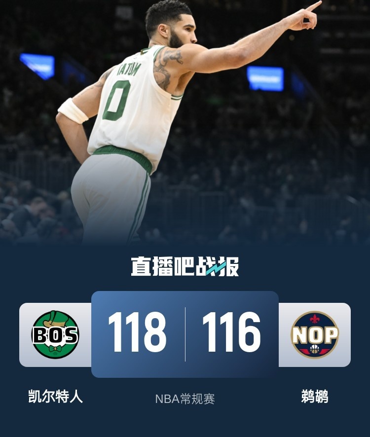 首节之争双方火力全开打出高效进攻,绿军开局虽然占优但后程乏力,双方最后3分30秒里合计飙进7记三分,鹈鹕凭借墨菲单节16分的表现反超比分;次节鹈鹕手感回落,首节砍下34分的他们这一节仅得19分,塔图姆节中连续命中三分带队送上20-9的攻势一举扭转局面并反超6分进入下半场。休息归来鹈鹕状态如同过山车一般又升至高点,墨菲也重新找回状态单节再砍11分帮助鹈鹕一度实现反超;绿军打得虽然被动但双探花相继拿分稳住局面,这之后绿军虽然一直占优但分差很小,墨菲最后关键进球一度帮助鹈鹕扳平比分,不过最后时刻双探花相继命中关键球,塔图姆更是命中制胜绝杀进球。最终,凯尔特人力克鹈鹕拿下比赛。