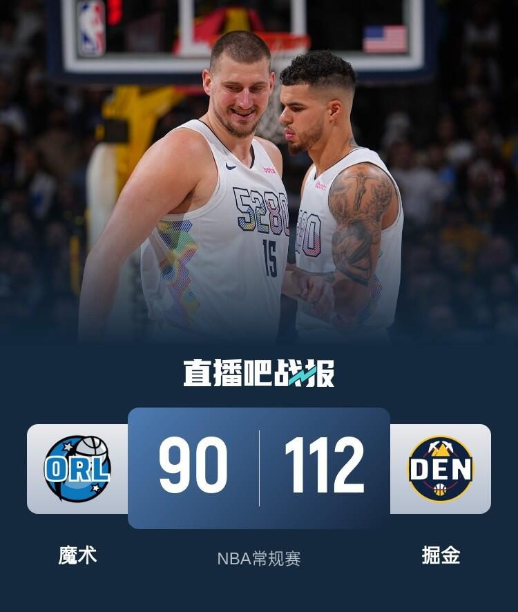 首节开打后约基奇率先发力,连续杀伤内线单节独得13分,魔术内外结合及时回应,双方你来我往比分紧咬,首节结束时魔术领先1分,次节回来,近来状态火热的小波特再度爆发,里突外投狂揽16分,约基奇外线续上火力,两人联手率队反超,半场战罢,掘金确立9分优势。易边再战后魔术进攻彻底断电,掘金将分差越拉越大,约基奇压哨拿到三节三双,三节结束后掘金已经领先25分,末节上来,两队尽遣替补,比赛提前失去悬念,最终掘金112-90大胜对手迎来5连胜。