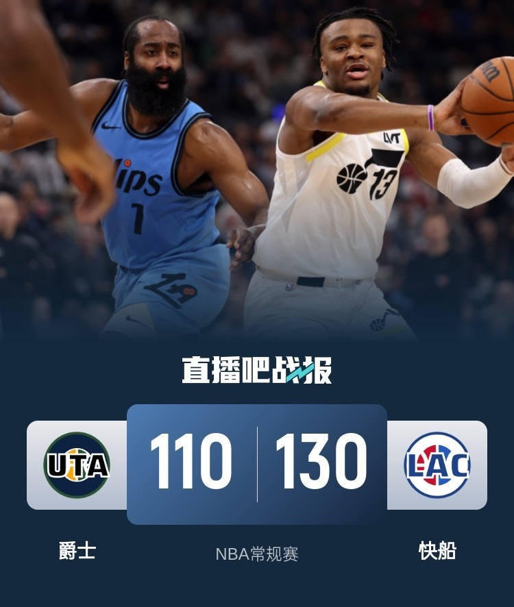 比赛开始,克拉克森上来就发力个人连砍11分打停快船,随后哈登接连送助攻,快船迅速追分首节仅落后1分,次节快船进攻端突然断电,爵士全民皆兵打出18-6攻击波领先到双位数,但鲍威尔里突外投连砍12分止血追分,快船半节回应21-6攻击波半场反超2分。下半场,双方展开拉锯战,爵士接连3记三分再领先,但哈登再次串联球队回应,随后哈登连砍6分带队8-0拉开比分,末节爵士继续通过外线追分,哈登连攻加传联手鲍威尔带队17-2攻击波再次拉开双位数领先,最终快船130-110力克爵士,终止3连败。