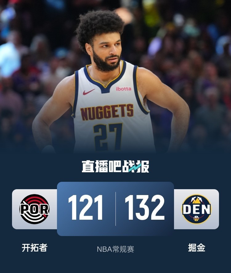 比赛开始,约基奇上来主要串联球队很快带队建立主动权,首节就送出7助攻,贾马尔-穆雷也是外线接连发炮单节14分,首节掘金轰下40分领先13分,次节开拓者全民皆兵开始追分,但穆雷继续出色状态,里突外投再轰16分强势回应,半场掘金依然领先19分。下半场,克林根内线打得不错,开拓者继续缩小分差,但约基奇联手穆雷总能给出回应,分差还是保持在20分左右,末节夏普里突外投连砍9分一度带队追到个位数分差,但贾马尔-穆雷抛投生涯新高强势回应,掘金始终保持十几分领先,最终掘金132-121力克开拓者,豪取8连胜的同时送对手3连败。
