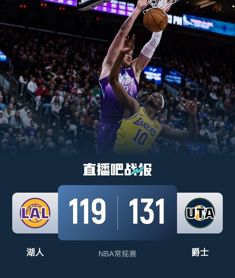 首节之争双方交替拿分势均力敌,湖人虽然稳定输出但无法阻止对手导致局面打得相对被动,末段爵士连着四波攻势全部转换成得分并守住3分优势;次节湖人短暂反超比分后又一次落入被动,爵士节中送出15-3的攻势一举拉开比分并奠定半场8分领先。休息归来湖人几次外线开火抢分但无法限制住对手的反击,节中黑色3分钟成为落败的转折点,爵士抓机会送上11-0的攻势一举拉开比分,湖人虽然随后回暖并有着单节30分的表现,但让爵士砍下40分导致分差一度被拉大至20分以上;这之后湖人完全无法起势,爵士将优势扩大至20分以上锁定胜局。最终,爵士主场复仇湖人,并终结湖人6连胜。