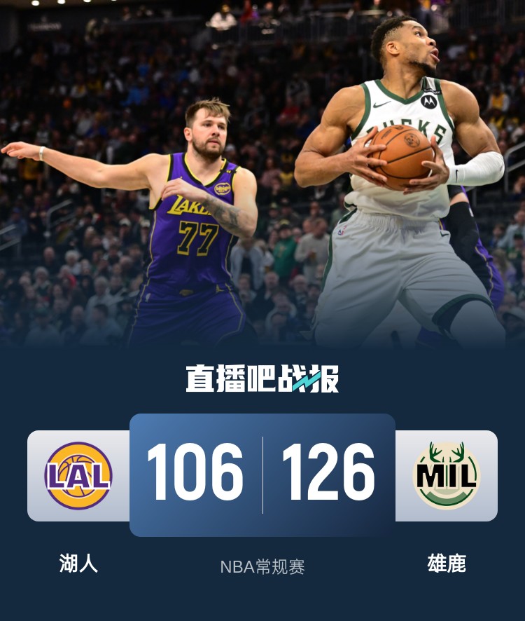 比赛开始,双方开场大打对攻,大洛高效发挥,字母哥和利拉德也联手拿分,东契奇火力全开,十八般武艺样样精通,带队顽强咬住,利拉德连续造成杀伤7罚全中,双方继续对攻,湖人一波10-0迫近比分,小凯文-波特独中3记三分立下奇功,范德比尔特连续内线得手,半场战罢雄鹿71-63领先湖人。易边再战,湖人命中率骤降,雄鹿不断冲击内线连投带罚一举将分差拉开到20分以上,末节里夫斯内外开花苦苦追赶,雄鹿连续造成杀伤保持20分左右优势,比赛还剩4分钟时湖人换下主力投子认负。最终,湖人106-126不敌雄鹿,遭遇3连败。