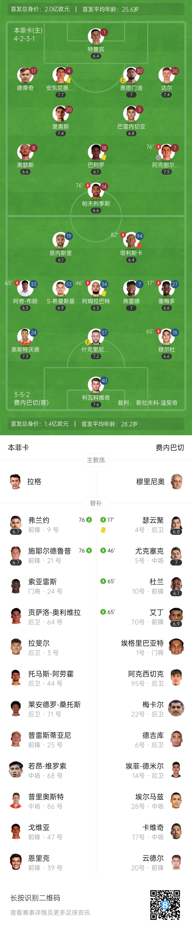 下半场补时5分钟。最终全场比赛结束,本菲卡1-0费内巴切。