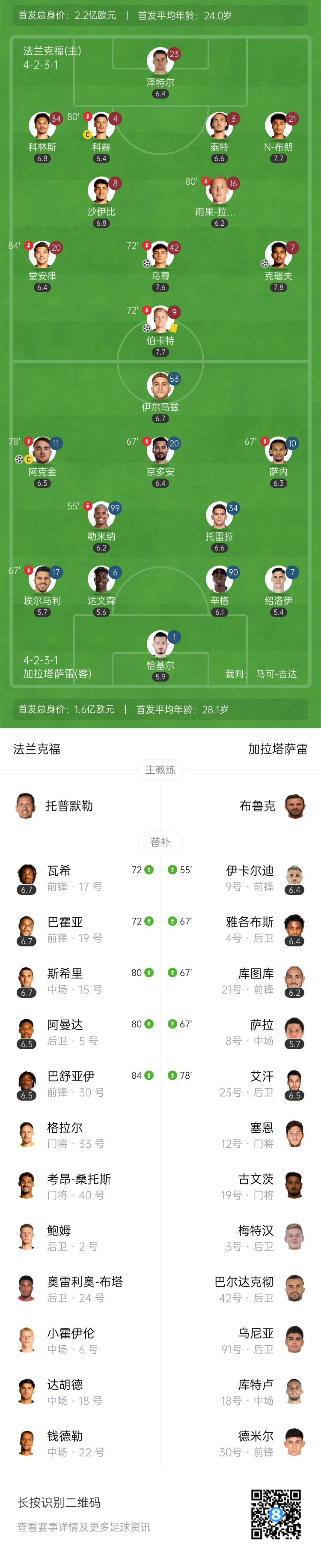 全场比赛结束,法兰克福主场5-1逆转加拉塔萨雷。