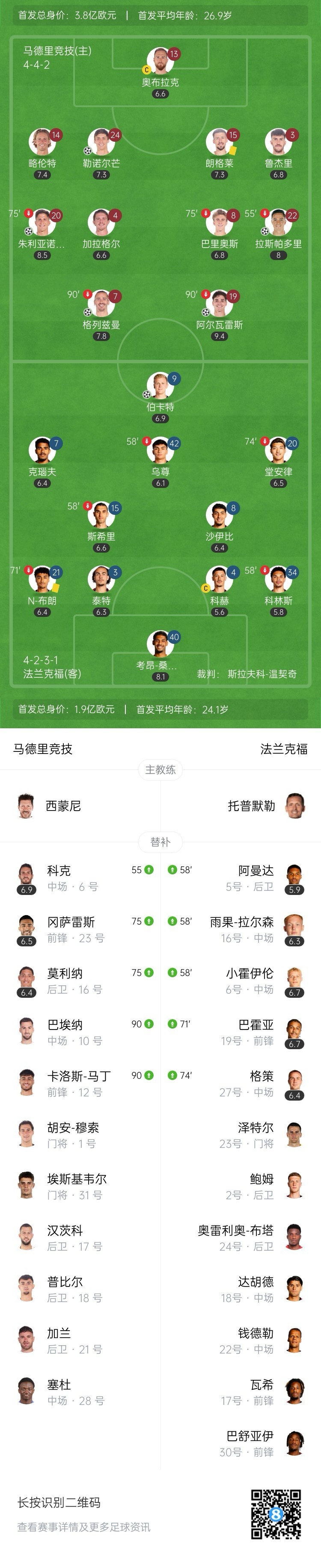 全场比赛结束,马德里竞技主场5-1大胜法兰克福。