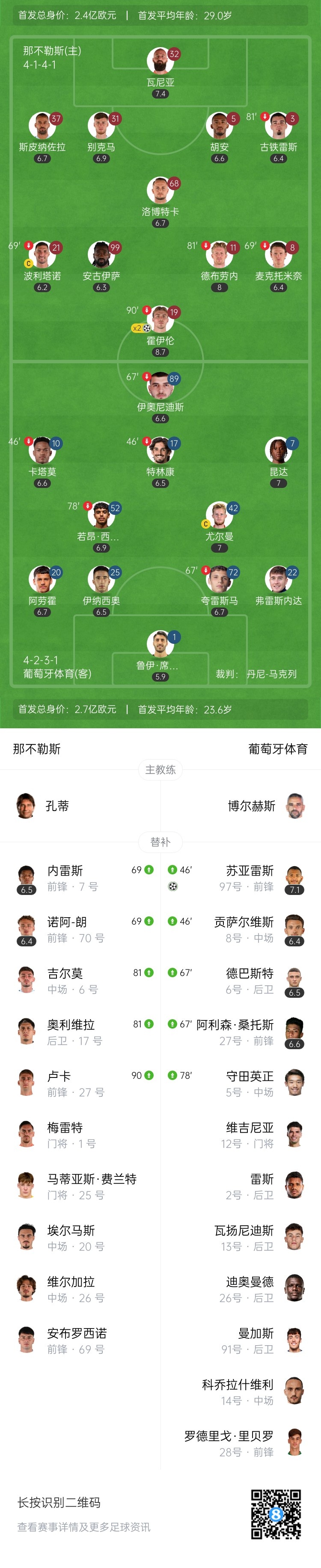 第79分钟,德布劳内左路传中,霍伊伦抢在门将身前头球破门!那不勒斯再度超出比分,2-1领先葡萄牙体育↓