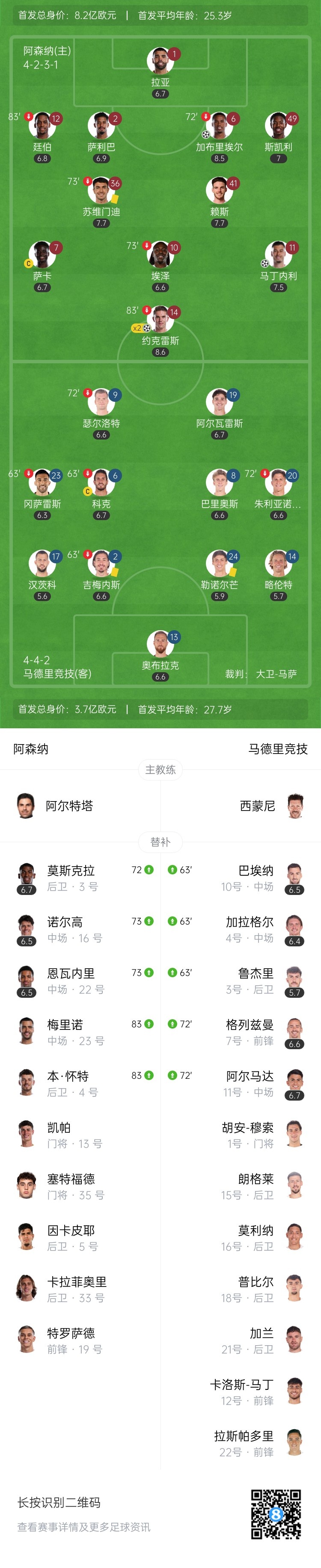 下半场伤停补时3分钟,全场比赛结束,最终阿森纳4-0马竞。