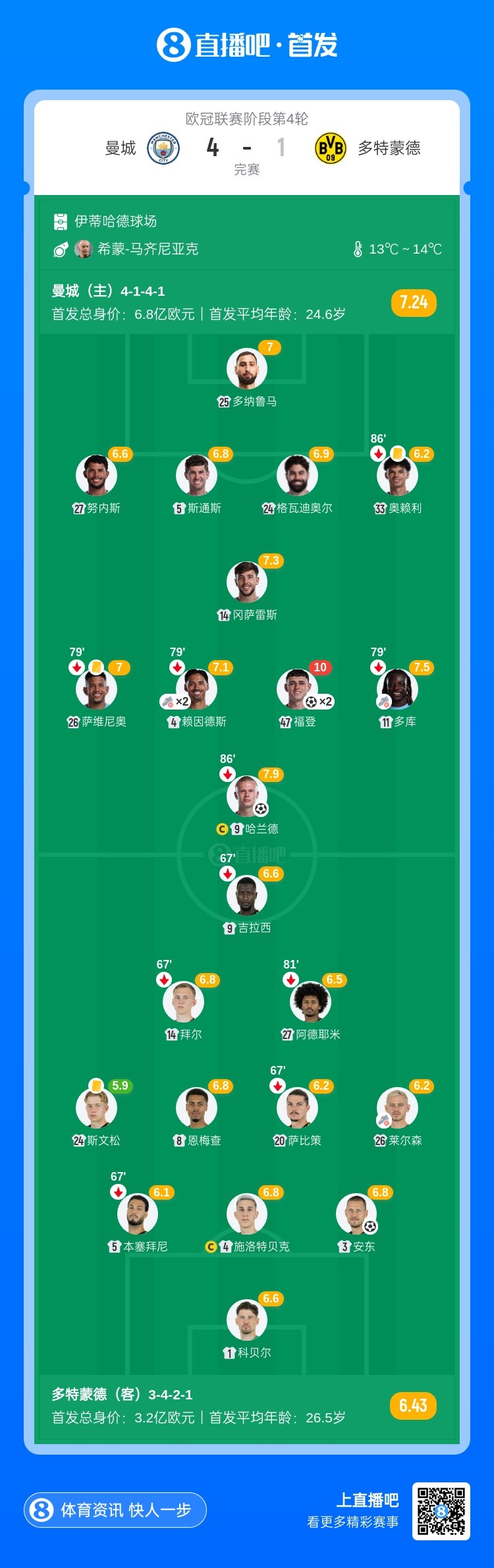 下半场补时4分钟。最终全场比赛结束,曼城4-1多特。