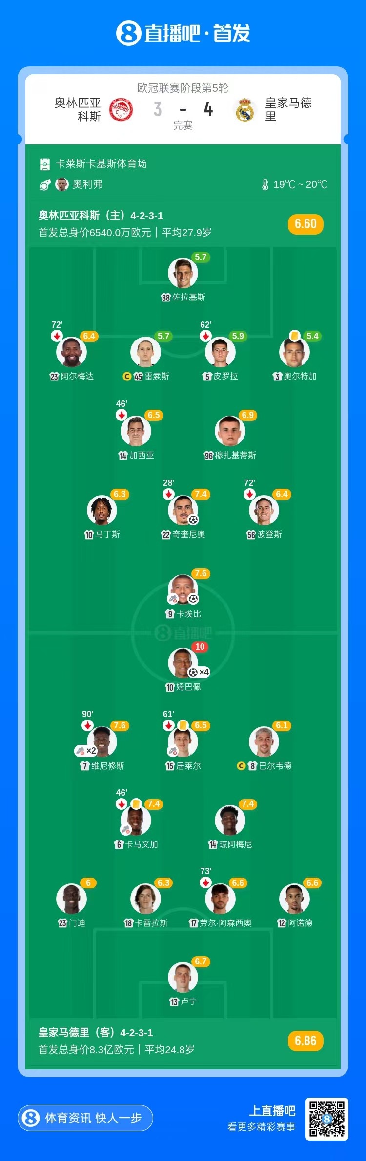 11月27日讯 北京时间4:00,欧冠联赛阶段第5轮,奥林匹亚科斯vs皇家马德里,比赛在卡莱斯卡基斯体育场打响!上半场,奇奎尼奥帮助奥林匹亚科斯率先破门!随后姆巴佩7分钟内上演帽子戏法!维尼修斯进球被吹;琼阿梅尼远射中横梁!下半场,塔雷米头球帮助主队扳回一球;维尼修斯助攻双响,姆巴佩完成大四喜!卡埃比头球再扳一球。最终,皇马客场有惊无险,4-3战胜奥林匹亚科斯,升至积分榜第5。