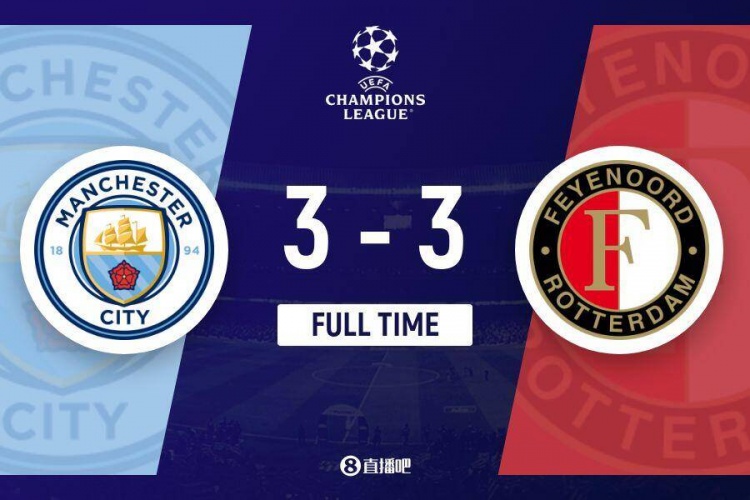 全场比赛结束,最终曼城3-3费耶诺德。