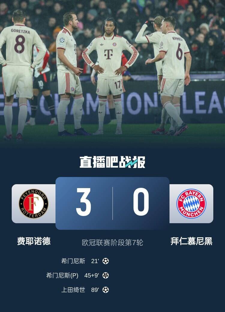 1月23日讯 北京时间1月23日凌晨4:00,欧冠联赛阶段第7轮,拜仁在德-库伊普球场客战费耶诺德。上半场金玟哉解围失误,圣地亚哥-希门尼斯破门,补时阶段阿方索-戴维斯伤退,格雷罗送点,圣地亚哥-希门尼斯点射再下一城,拜仁半场暂0-2费耶诺德;下半场萨内中柱,上田绮世反击破门,最终拜仁客场0-3不敌费耶诺德,欧冠三连胜被终结,仍积12分,费耶诺德积分来到13分。