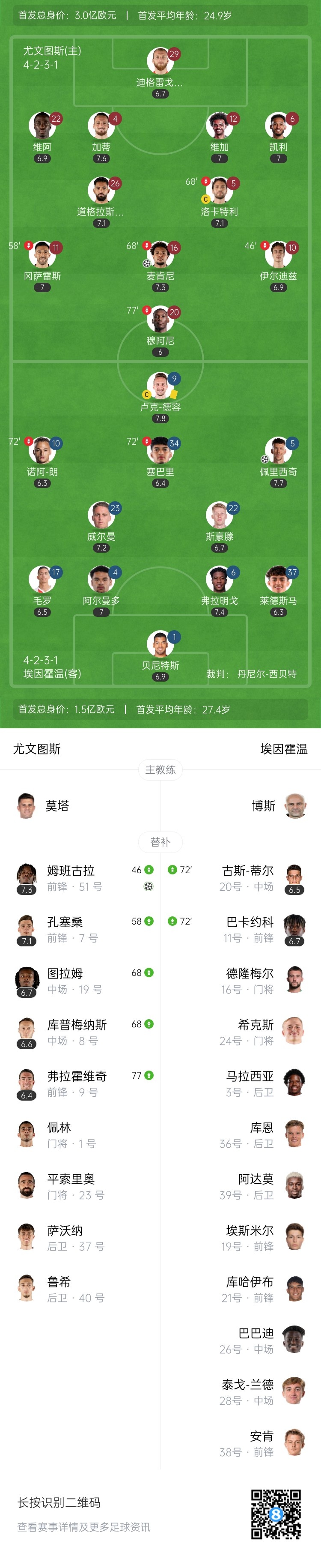 下半场补时4分钟。最终全场比赛结束,尤文2-1埃因霍温。