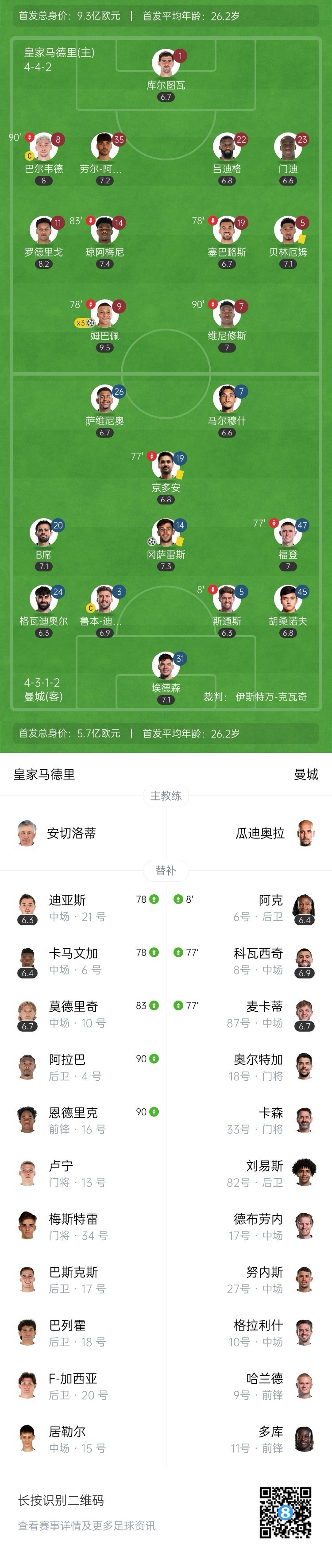 全场比赛结束,皇马主场3-1战胜曼城,总比分皇马6-3淘汰曼城。