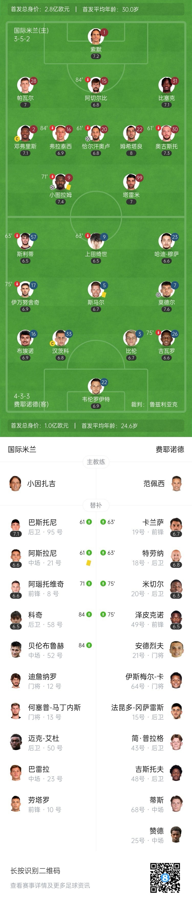 全场比赛结束,国米2-1费耶诺德。