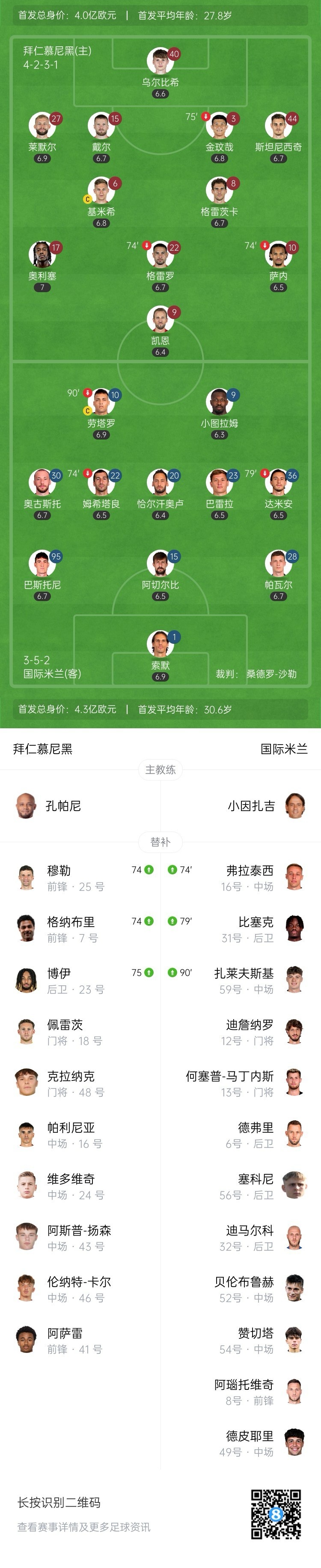 全场比赛结束,国际米兰客场2-1战胜拜仁慕尼黑。