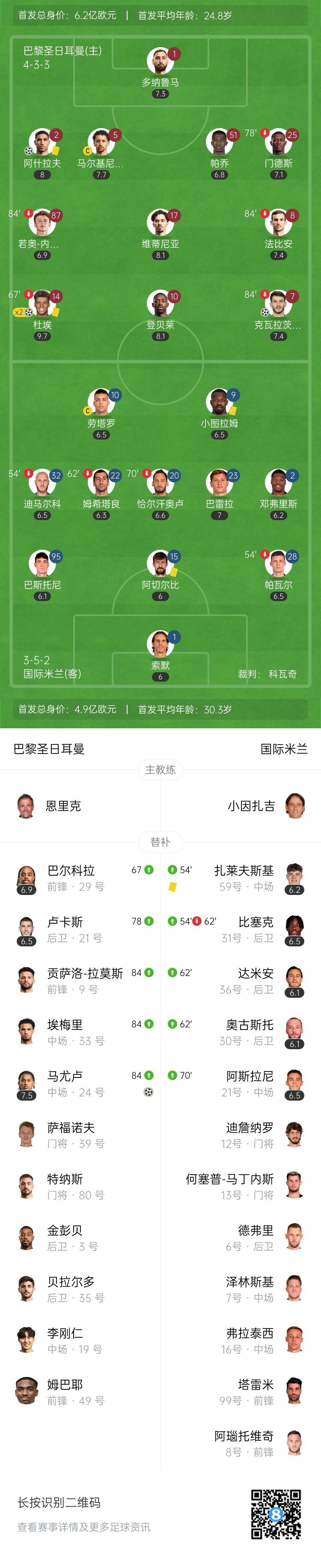 巴黎锁定胜局!K77破门,登贝莱两送助攻!第73分钟,登贝莱中场送出直塞,克瓦拉茨赫利亚单刀杀入禁区劲射得分,巴黎圣日耳曼4-0国际米兰!↓