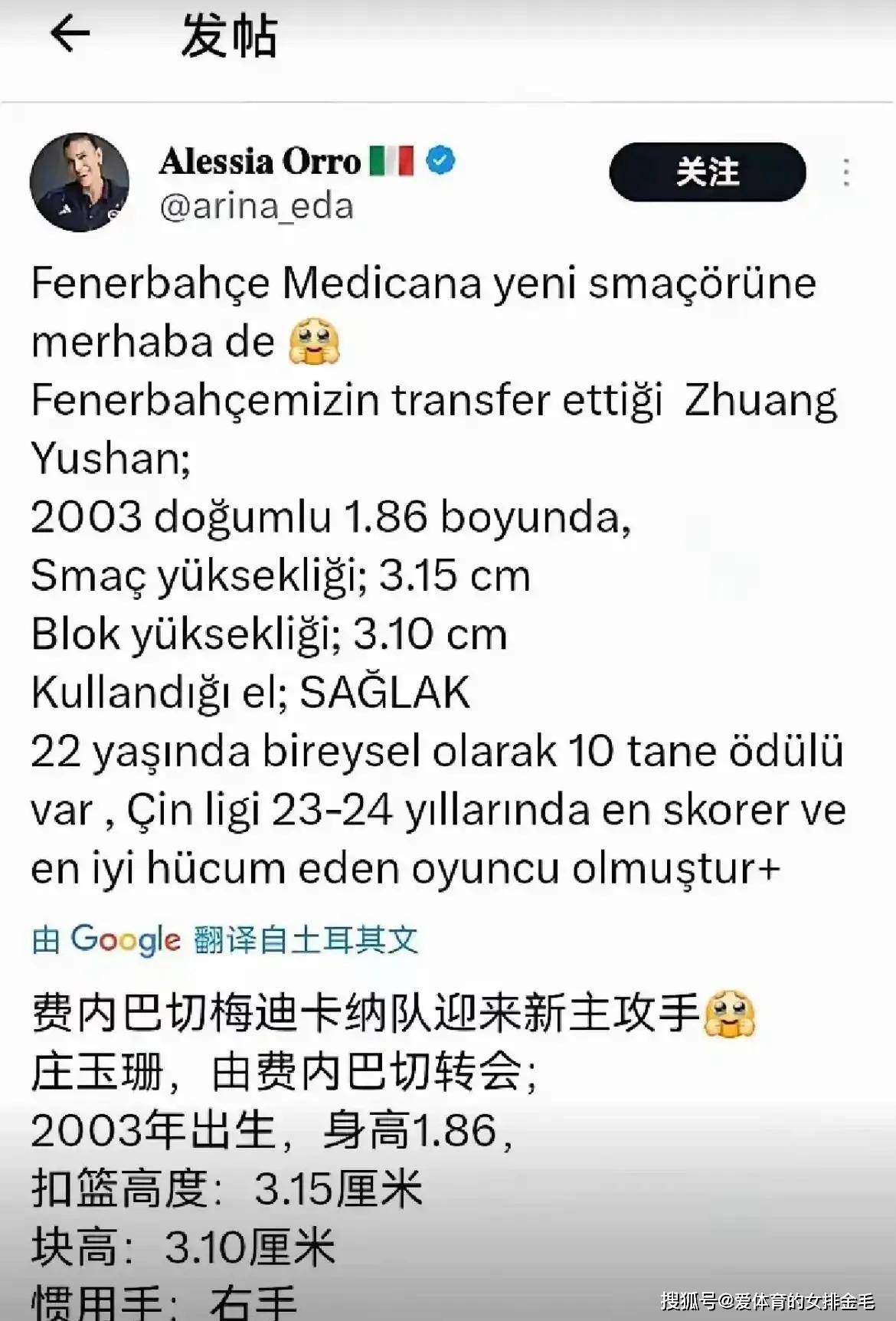 祝贺庄宇珊了,希望可以通过高水平联赛提高自己!费内巴切女排现在急需主攻,估计安娜受伤,大部分主攻都签了,能找到庄宇珊算不错的选择!