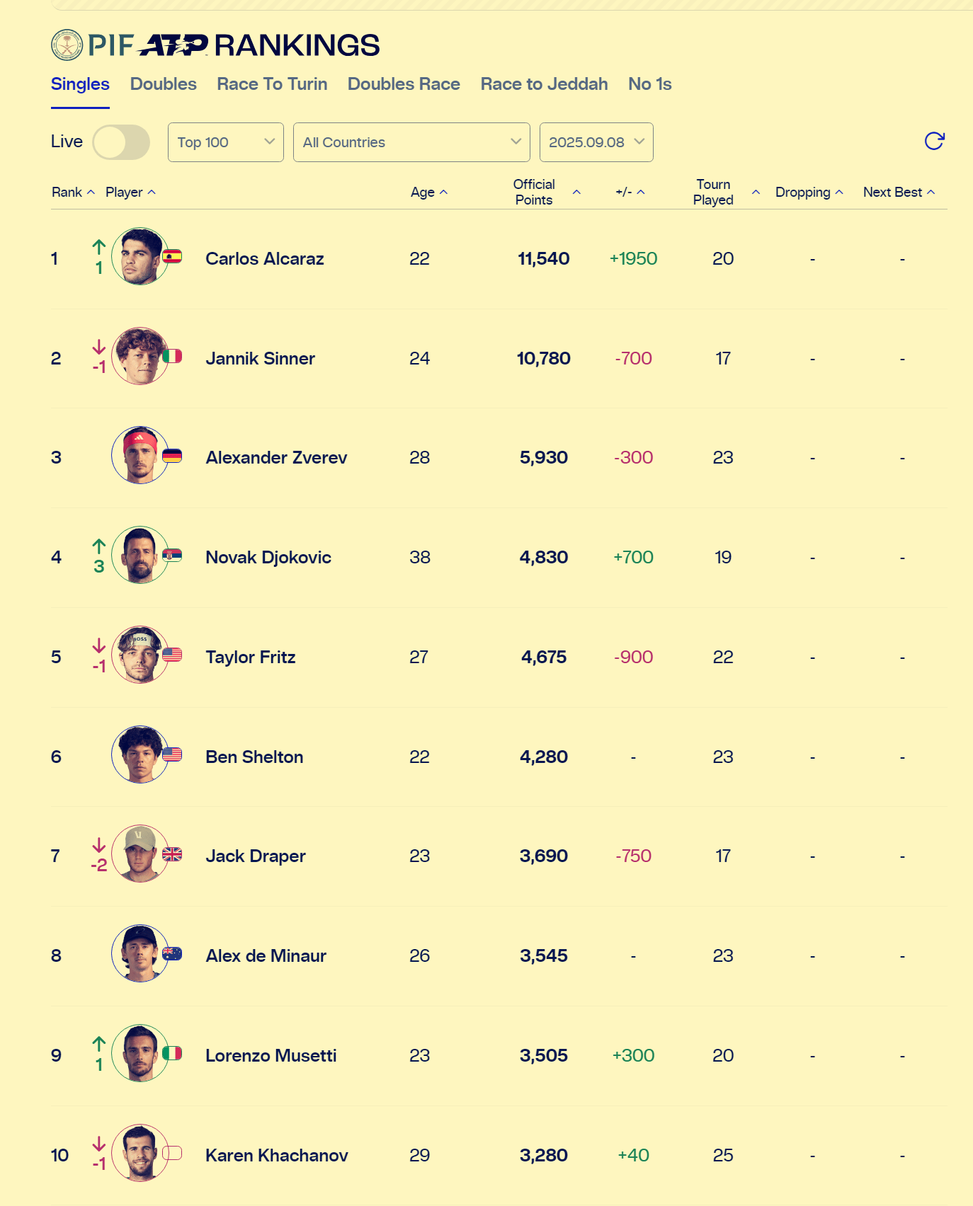 北京时间昨天下午,ATP/WTA相继更新了最新一期世界积分排名榜。男单方面:西班牙红星阿尔卡拉斯携美网冠军奖杯重返世界第一,辛纳和兹维列夫分别排在第二和第三位。打进四强的德约科维奇升至世界第四,其他TOP10的排名略有升降。