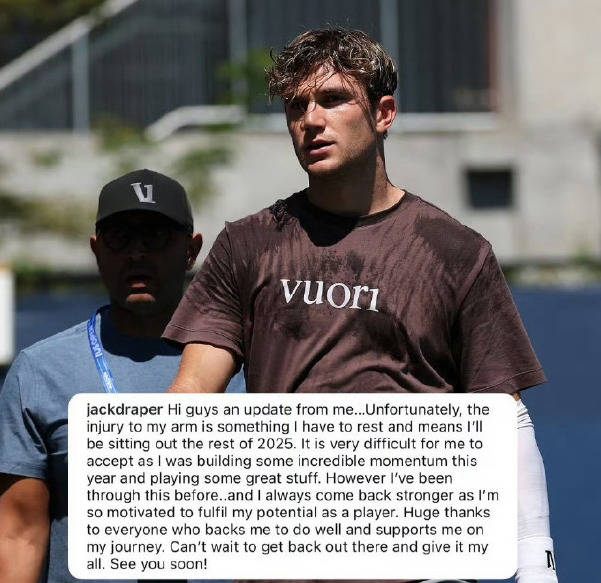 我们再来关注球员动态。北京时间今晨,英国一哥德雷珀官宣,因自己的左臂骨挫伤,决定提前结束本赛季,“很遗憾,我的手臂受伤了,我不得不休息,这意味着我将缺席2025年剩下的比赛。这对我来说很难接受,因为我今年正展现着惊人势头,打出了一些精彩的表现。”德雷珀在今年的美网第二轮赛前宣布因伤退赛,没想到他伤得这么重。