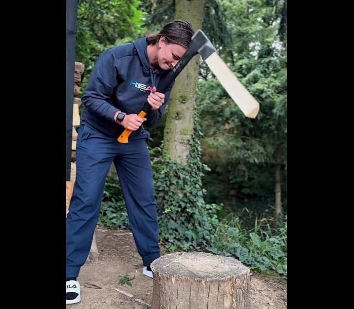 最后来猜一猜认一认。下面这张图片是一位球员在学习劈柴。不作提示,您能认出她是谁吗?
