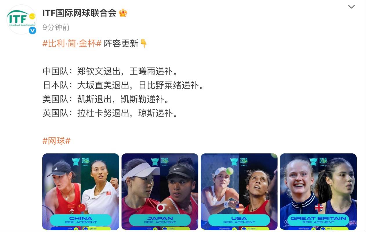9月9日,国际网球联合会(ITF)消息,中国球员郑钦文退出2025比利·简·金杯总决赛中国队阵容。