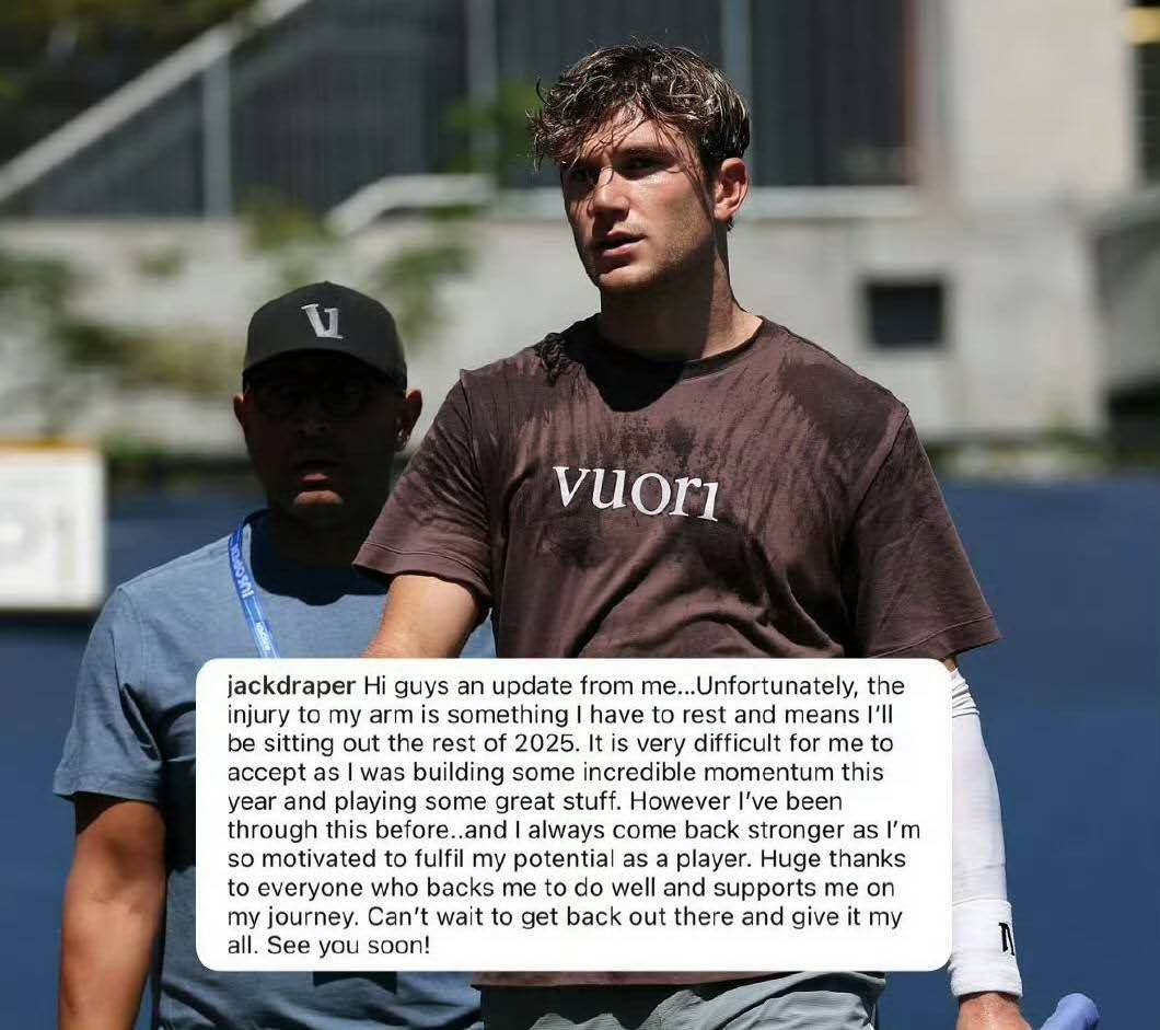 此外,世界排名第七的英国网球名将杰克·德雷珀于9月9日通过个人社交平台宣布,因手臂伤势未愈,将退出2025赛季所有剩余赛事。这位刚在印第安维尔斯大师赛夺得生涯最重要冠军的英国一哥无奈表示:“这个决定非常艰难。今年我积累了出色的状态并打出了精彩的比赛内容。”