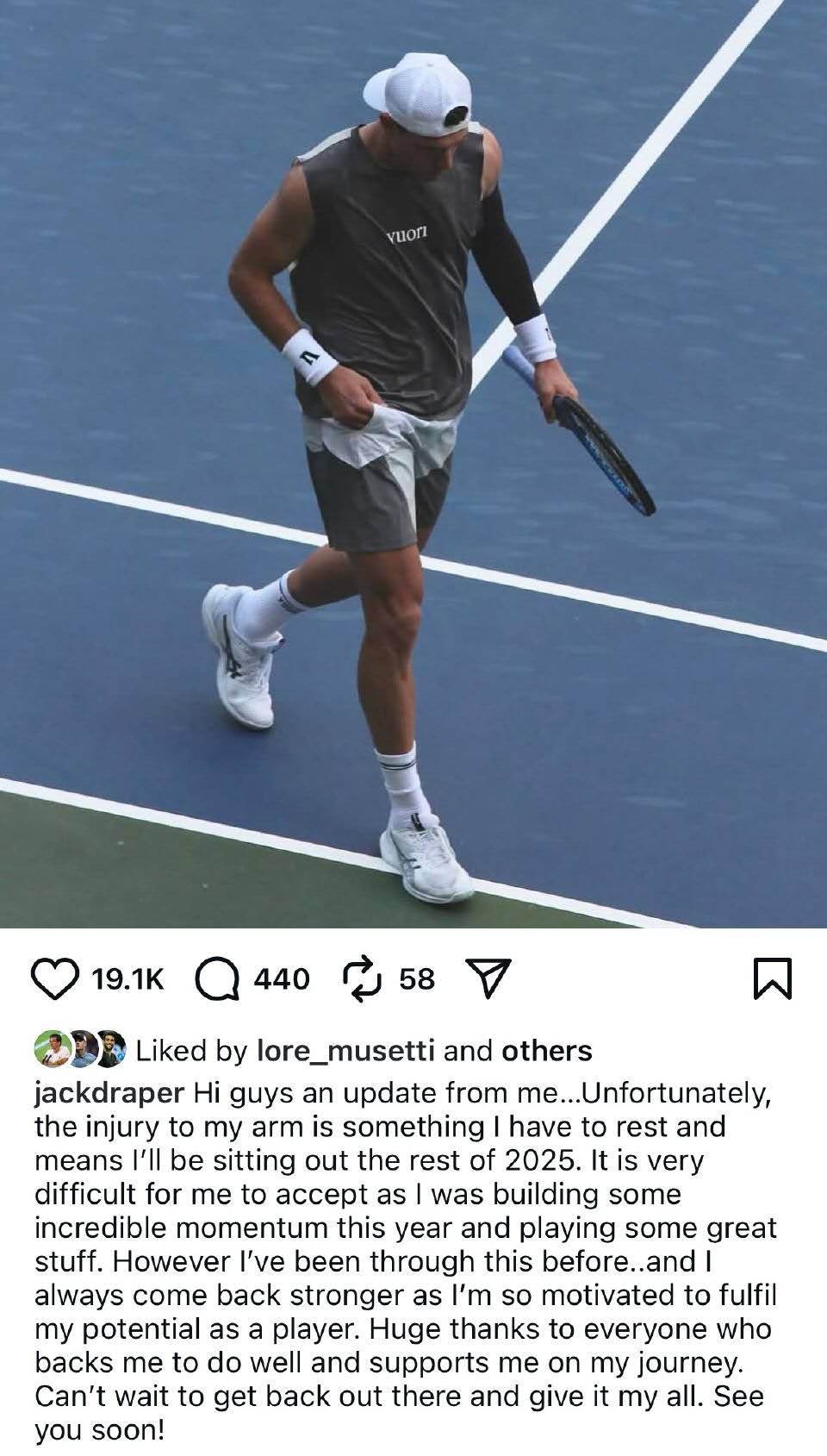 德雷珀赛季报销的消息传出后,网球界纷纷表达惋惜与祝福。