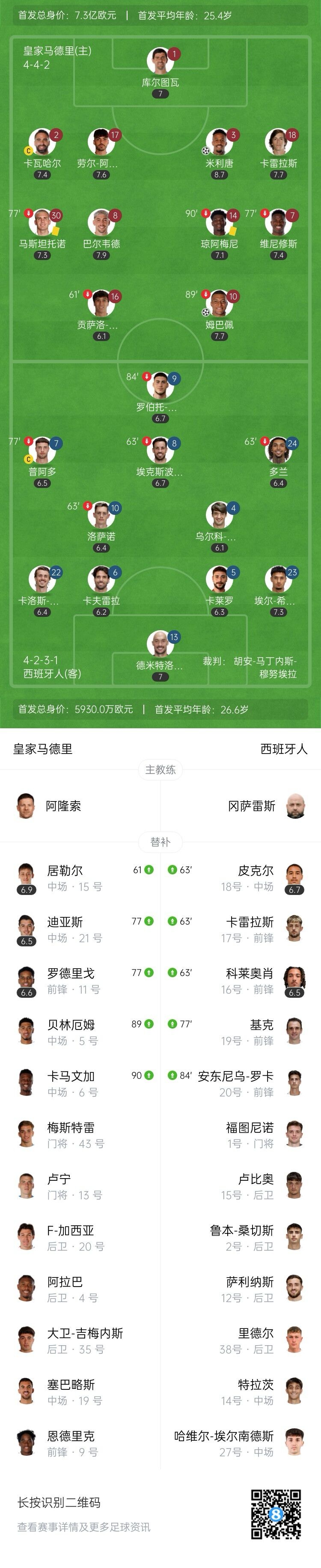 全场比赛结束,皇马2-0西班牙人。