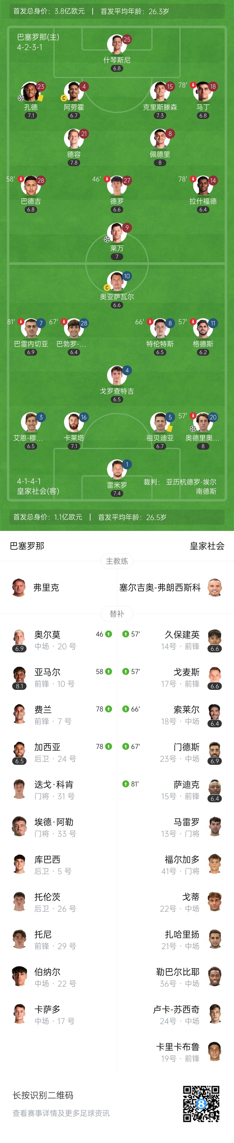 第59分钟,奥尔莫分球,替补登场的亚马尔右路突入禁区,随后传中球送到门前,莱万头球攻门击中立柱弹进网内,巴塞罗那2-1皇家社会。↓