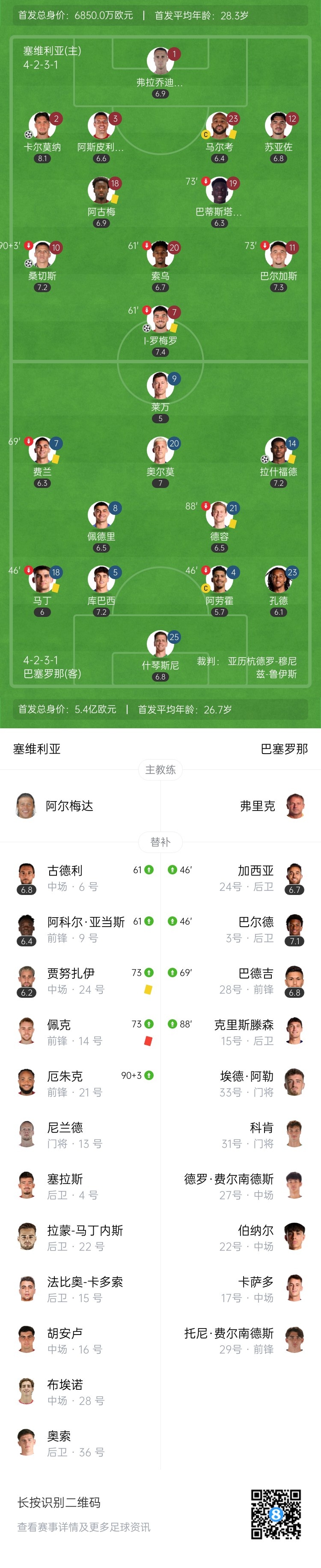 下半场伤停补时8分钟,全场比赛结束,最终巴萨1-4塞维利亚。