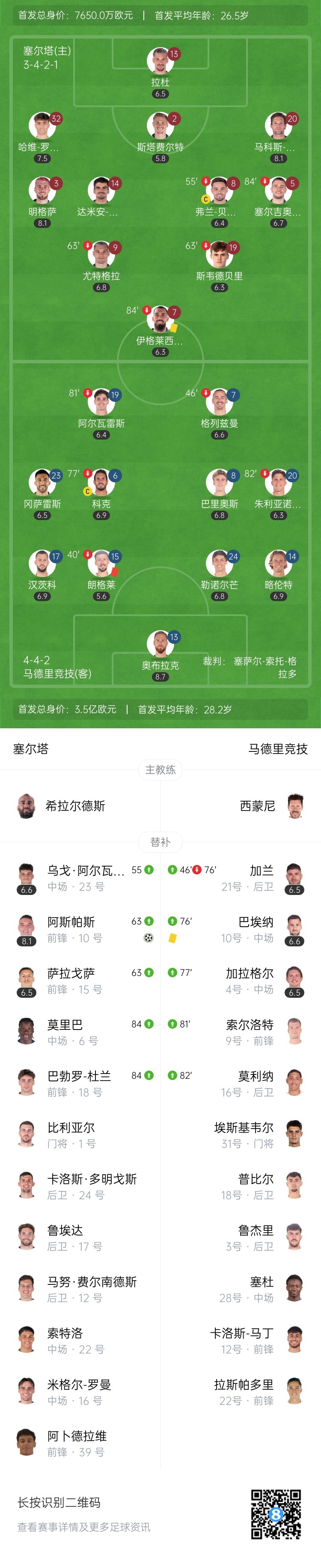下半场补时6分钟。最终全场比赛结束,塞尔塔1-1马竞。